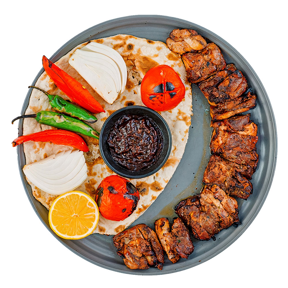 8 سیخ 250 گرمی گوشت خالص مخلوط گوسفند و گوساله همراه با گوجه، لیمو، سبزیجات کبابی و سس ریحان