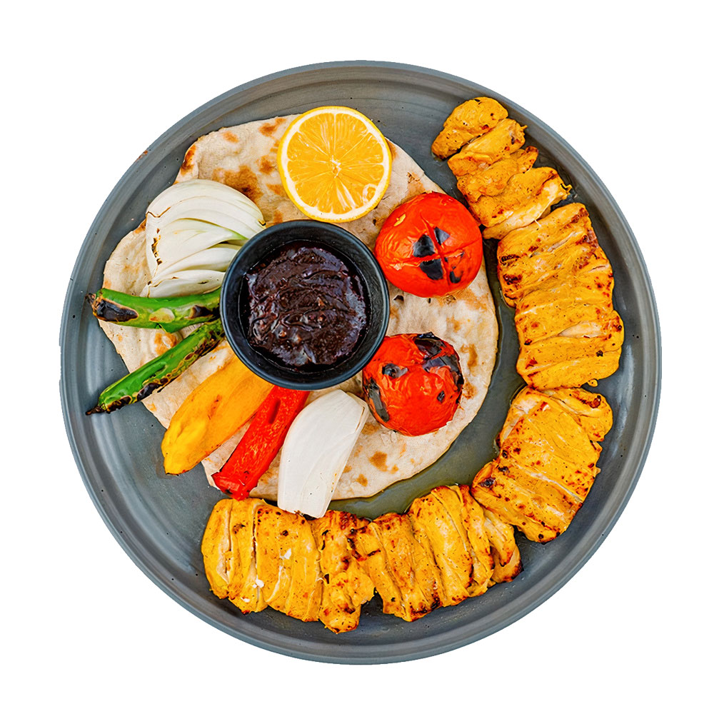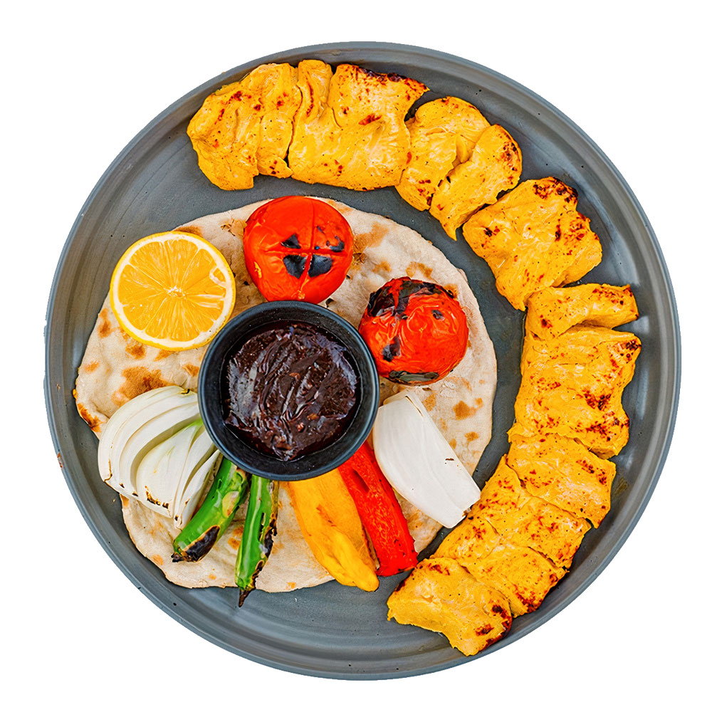 350 گرم فیله مرغ مزه دارشده با ماست و ادویه همراه با گوجه، لیمو، سبزیجات کبابی و سس ناردونی