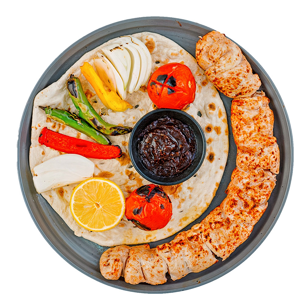 سه عدد شیشلیک سیگنیچر ، نصف جوجه ارگانیک همراه با گوجه ، لیمو ، سبزیجات کبابی و سس ریحان