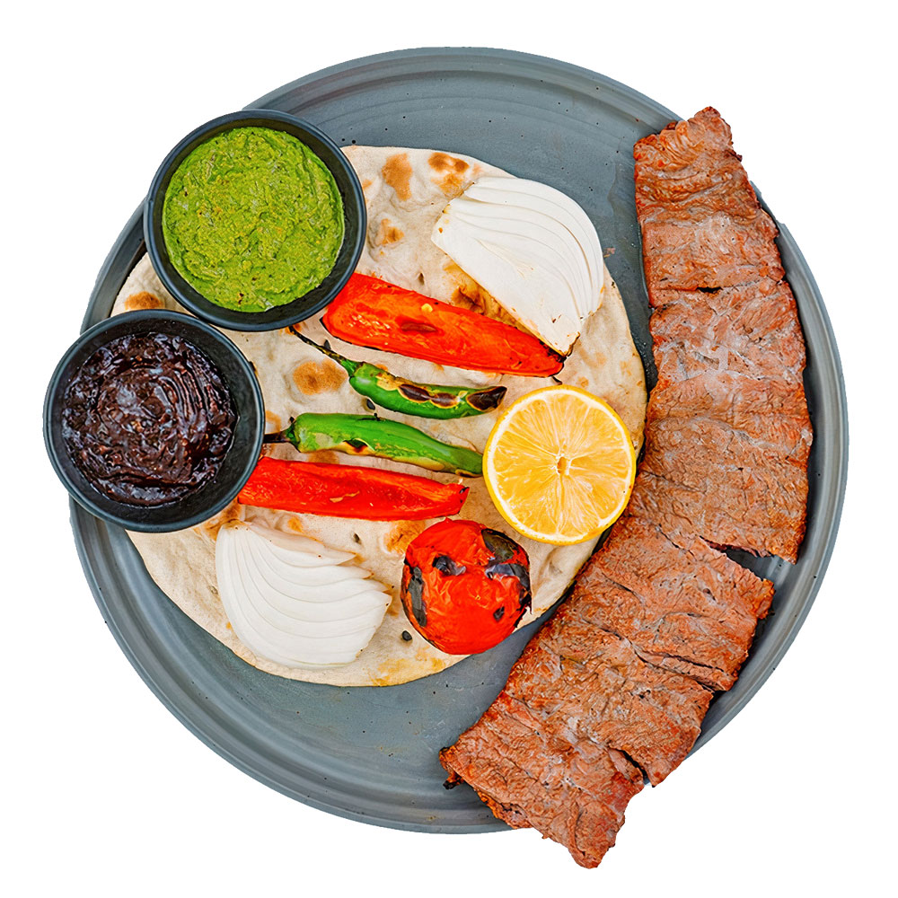 1 سیخ 250 گرمی گوشت مخلوط گوسفند و گوساله همراه با گوجه ، لیمو ، سبزیجات کبابی و سس ریحان